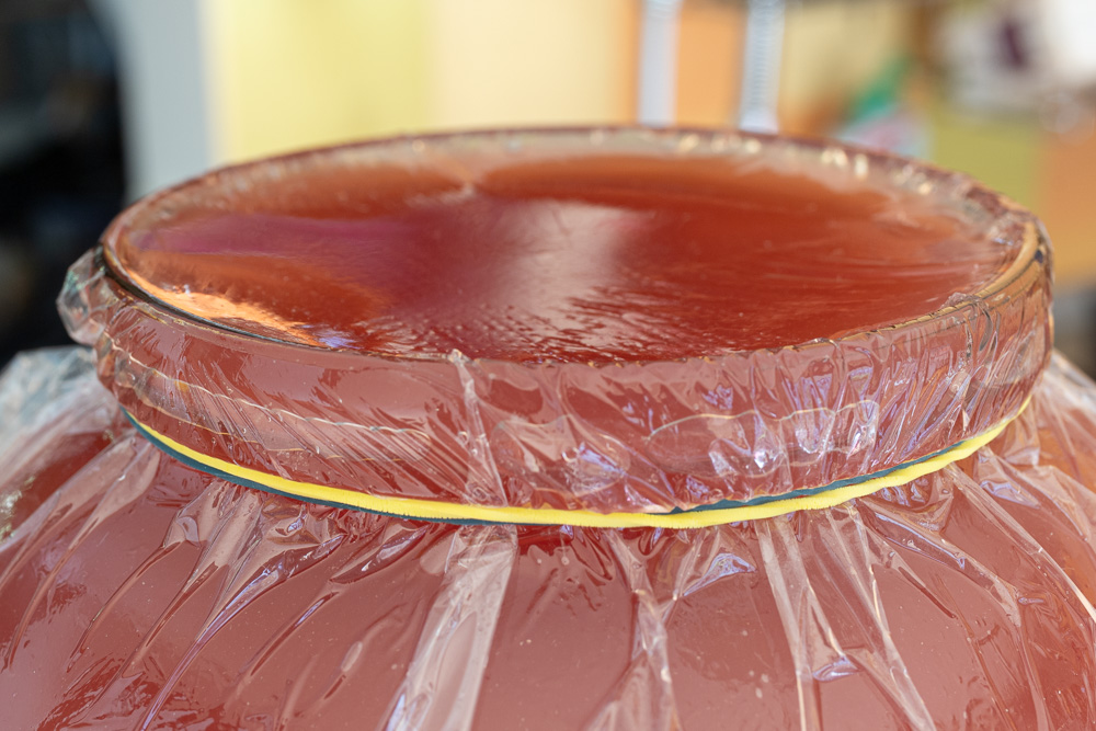Vlastně není vůbec jednodušší metody, jak zamezit přístupu vzduchu, než vzduch vytlačit samotným materiálem — jiné metody už ani nepoužívám. Svou nádobu prostě naplňte až po okraj a zavřete víčkem. Víčko by nemělo být utažené ani moc, ani málo. Když bude utažené moc, nebudou moci plyny ven, uvnitř se bude budovat přetlak a sklenice po otevření přeteče jako šumák. Když bude nedotažené, dostanou se dovnitř spory plísní spolu s nežádoucím kyslíkem. V počátečních dnech můžete jednou za den přebytečný tlak odpustit, vůbec nevadí, že se nějaký vzduch dovnitř jednorázově dostane, během chvilky se vymění za CO₂.
