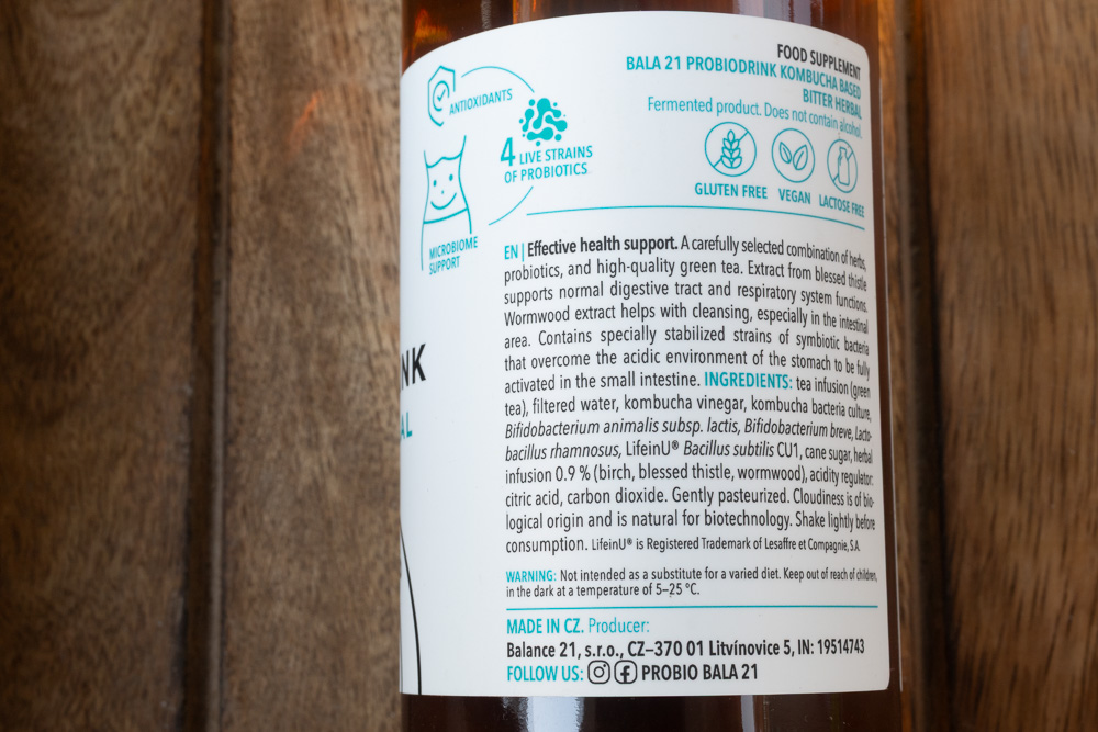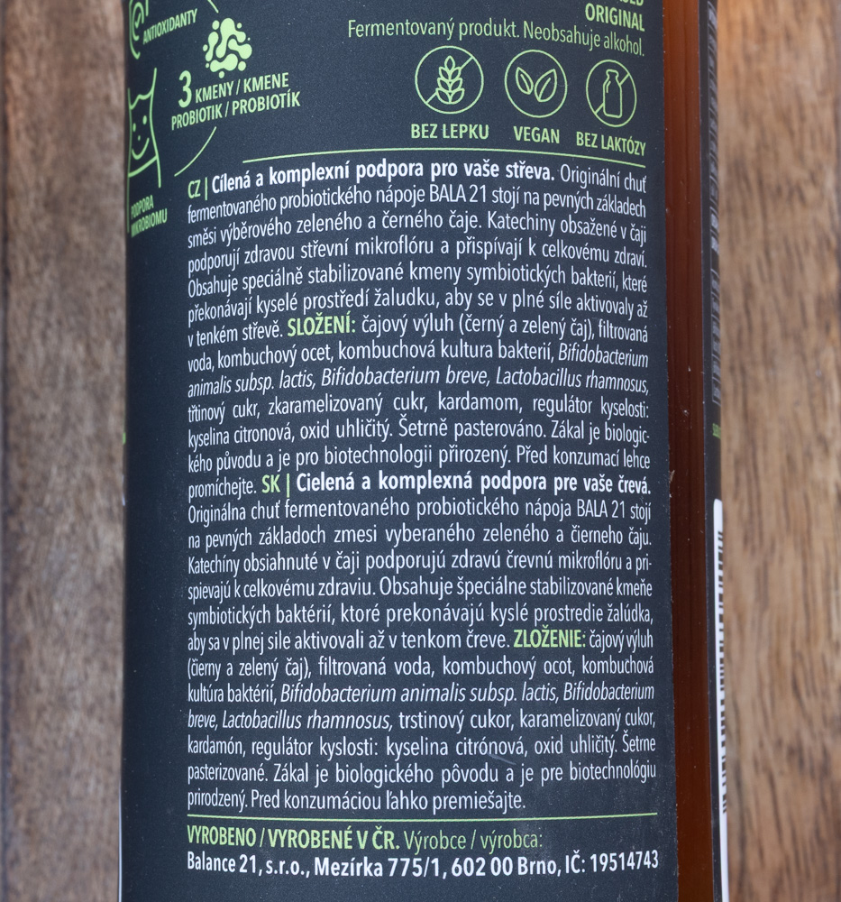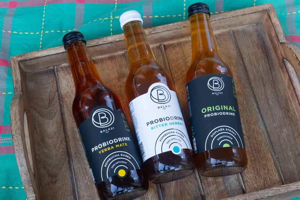 Zde se výrobce tolik snažil nadesignovat doplněk stravy s přidanými probiotiky, že úplně zapomněl na to, že také vytváří nápoj. Druh výrobku Original chutná slabounce kombuchově sladkokysele a i když kombuchovou DNA nezapře, tak jde o absolutní minimum vynalézavosti či zajímavosti. Druh Yerba maté zaujme tím, že nemá chuť žádnou jinou než maté s bublinkami. Žádná sladkost, žádná kyselost, prostě jen mírně trpký a našuměný odvar z cesmíny s typickou mírnou kouřovo-karamelovou notou. Ano, mohou to diabetici, ale ve skutečnosti je to jako potravinový výrobek spíš nedobré. Veselejší a chutnější je i obyčejný domácí neslazený čaj s citrónem. Druh Bitter herbal mě dost zajímal, protože jsem byl zvědavý, jak odvážný a vynalézavý byl výrobce s komponováním hořčin, ze kterých se nechají postavit fakt veliké dobroty. Ne tak docela u výrobku Bala21, kde není po obsaženém pelyňku ani památky, hořčiny zůstaly schované někde v šuplíku, docela pěkná je univerzální bylinková vůně, kterou bych pojmenoval „horská louka“.