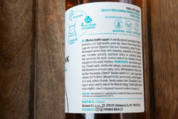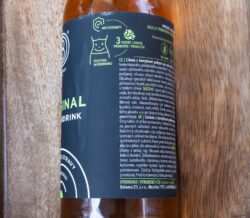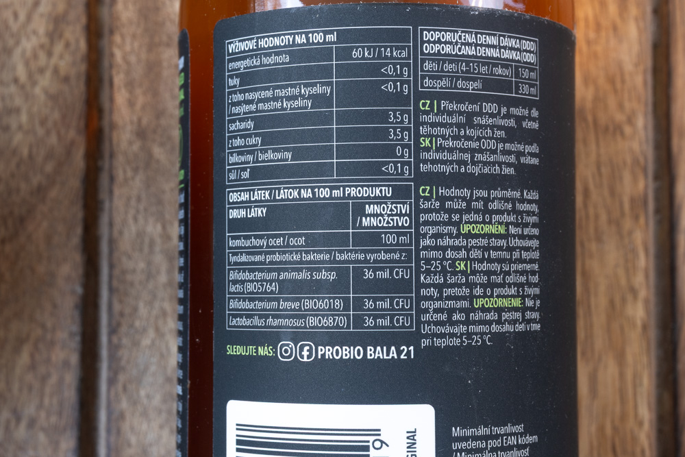 - Bez laktózy — i zde si myslím, že jde o úplně zbytečný údaj, protože u žádného kombuchového/čajového nápoje nedává přítomnost laktózy smysl; klidně bych vsadil soudek misa na to, že zde výrobce využil módního a ničím neopodstatněného strachu spotřebitelů z laktózy a jen hledal další logo, kterým by mohl vylepšit obraz výrobku v očích těch spotřebitelů, kteří hledají potraviny zbavené všeho zlého