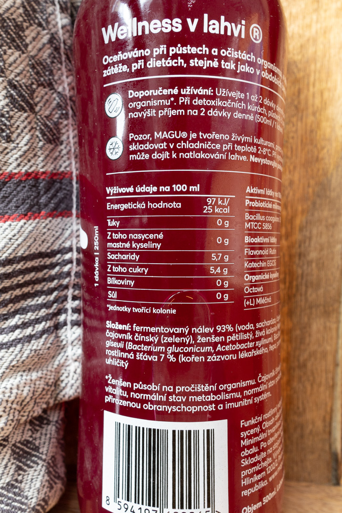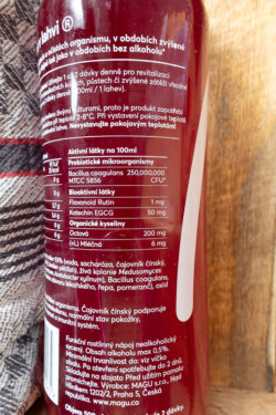 - živá kolonie Medusomyces gisevii — tady výrobce neváhal sáhnout po sto let starém omylu, aby vyvolal dojem výjimečnosti a vědeckého zařazení kombuchové kultury; celý příběh vzniku mýtu o houbě jsme už rozkryli; na etiketě jsou vyjmenovány bakterie Bacterium gluconicum, to je starý název pro Gluconobacter oxydans a ten se používá k výrobě kyseliny glukonové nebo vitamínu C; vyjmenován je i Acetobacter xylinum, což je opět dávno překonané taxonomické zařazení našeho známého a běžného Komagataeibacter xylinus odpovědného za štrikování placky; obě máte nejspíš ve svých domácích kombuchách taky