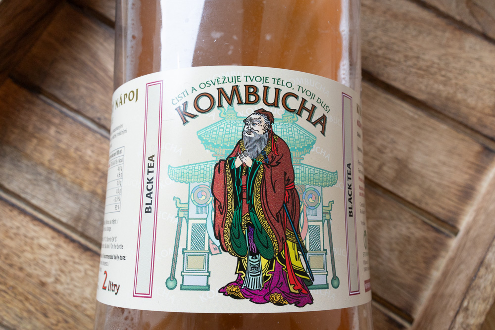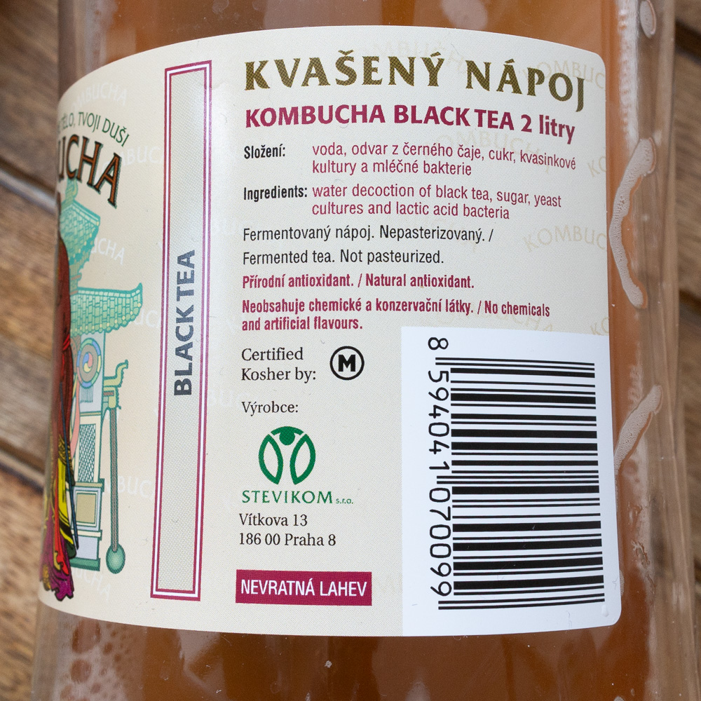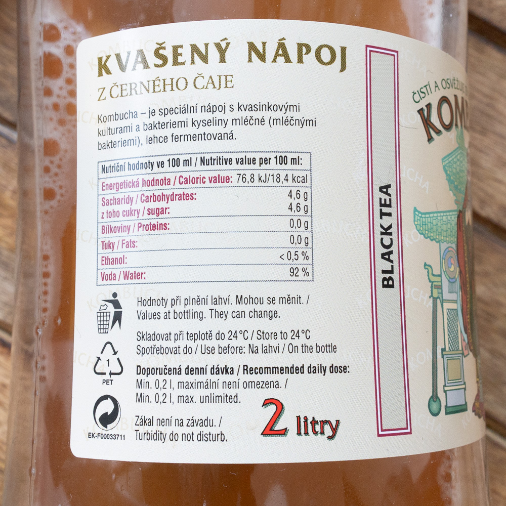 Deklarace výrobku: „Fermentovaný nápoj nepasterizovaný“ a k tomu ještě vysvětlení „Kombucha — je speciální nápoj s kvasinkovými kulturami a bakteriemi kyseliny mléčné (mléčnými bakteriemi), lehce fermentovaná“. Když pomineme neuchopitelný termín „speciální“, dostáváme vysvětlení o laktobacilech, ovšem to není vůbec dobrá zpráva, protože kombuchové nápoje už víc než sto let stojí na octových bakteriích tvořících solidní celulózový biofilm, zakyselené mají být primárně kyselinou glukonovou a octovou, nikoliv mléčnou. Výrazně mě překvapila uvedená kombinace informací: nepasterizovaný stav, pokyn „Skladovat při teplotě do 24 °C“ a dvouletá trvanlivost; výrobek opravdu fermentuje v PETu dál a i při teplotách kolem 0 °C mi narubaly mikroorganismy nezanedbatelné množství CO₂. Ono se to nezkazí, to ne, ale v teple mikroorganismy strašně vyžerou cukr a může se to nafouknout opravdu hodně, byl bych opatrný i na překročení 0,5 % hranice alkoholu.