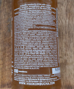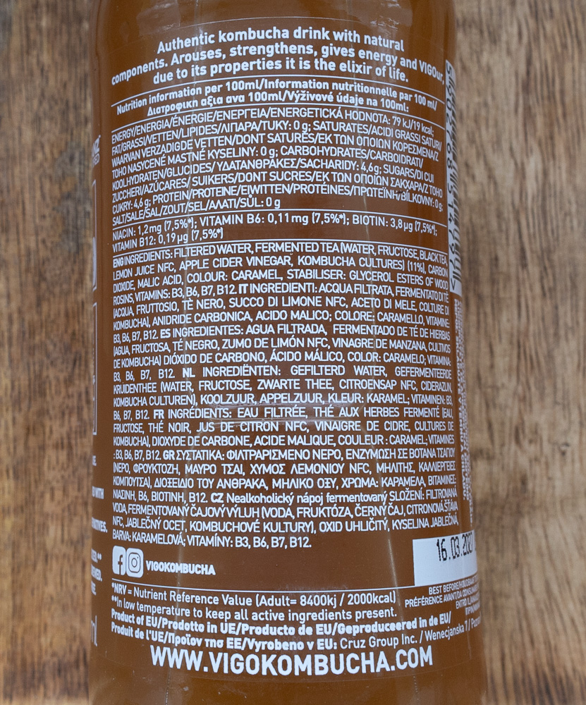 Obecně jsou informace na etiketě roztříštěné, hrozně malým písmem kvůli vícejazyčnosti a občas se zde výrobce snaží lákat na klíčová marketingová slova (došlo i na elixír života), vyzdvihuje běžné vlastnosti a spojuje kombuchové kultury automaticky s probiotičností. Nejsem spokojen.