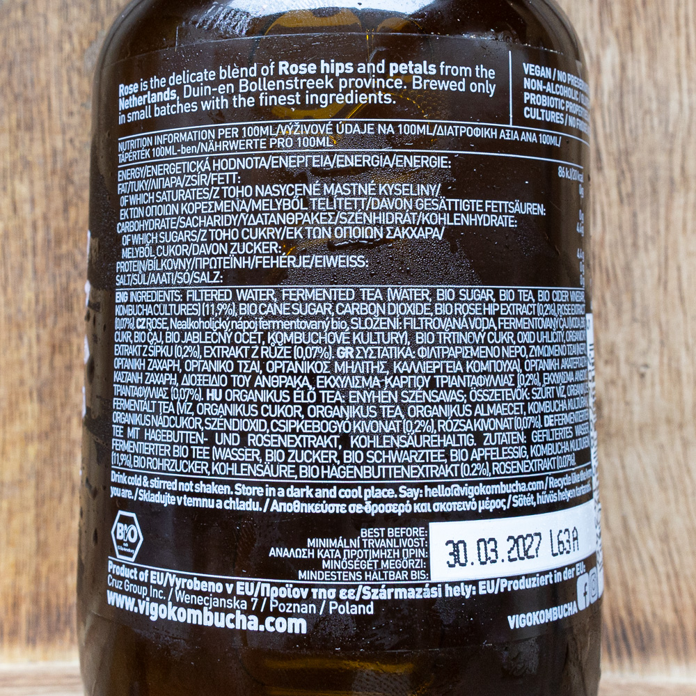 Složení růžové BIO varianty v černém skle: fermentovaný čaj, cukr, jablečný ocet, kombuchové kultury, oxid uhličitý, extrakt z plodů a okvětních lístků šípkové růže z Holandska.