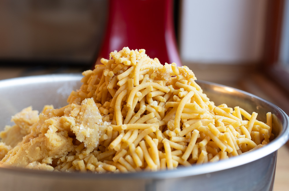 Chvíli jsem z toho byl nanicovatý a pár dnů jsem nechal nadbytečné nepoužité porce povalovat v lednici, že s nimi nakrmím později kompost. On i začal trochu kysnout, protože se do uvařeného a houbou předtráveného hrachu pustily bakterie mléčného kvašení, tak už mi to ani moc nechutnalo opečené. Pak jsem si ale vzpomněl, že jsem kdysi už jeden pokus o záchranu slabého tempehu provedl a bylo to moc dobré! Tentokrát jsem měl v ruce celé kilo bídy, tak proč nespáchat ZNC čili z nouze ctnost?