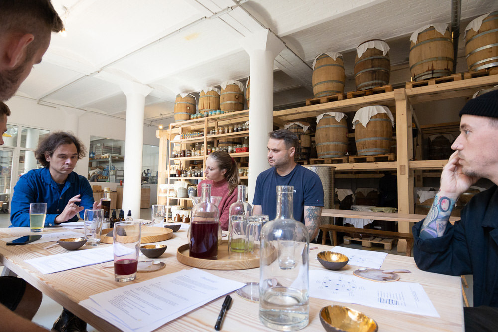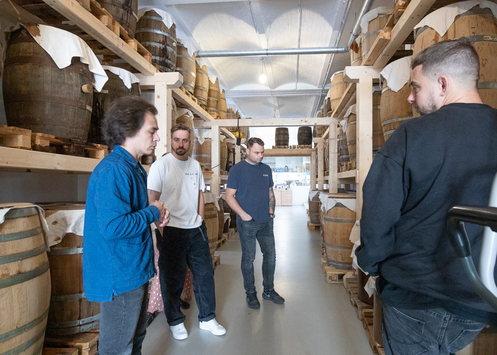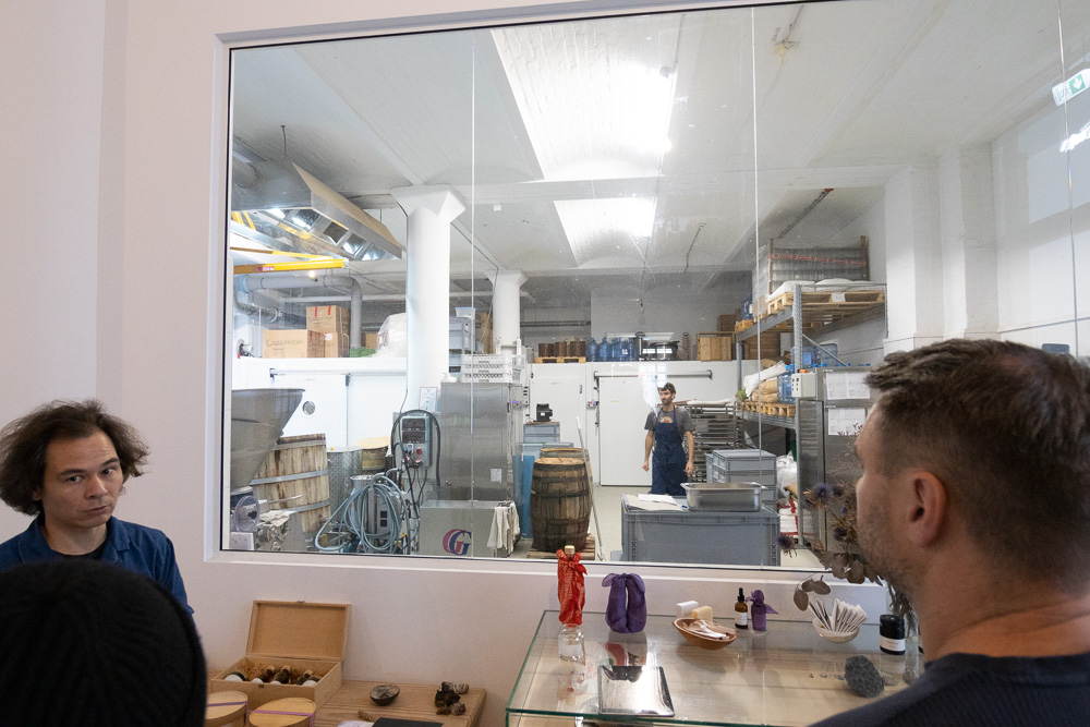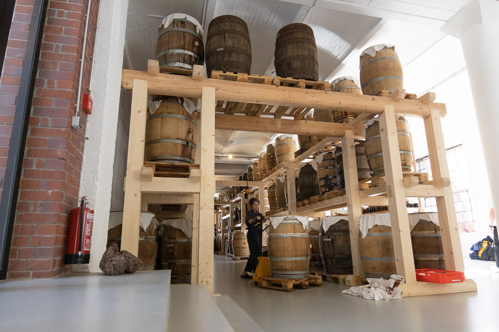 V bývalém městském továrním komplexu na žárovky Osram Höfe jsme se sešli v 9 ráno a jen co jsme omrkli zběžně krásné a nově zrekonstruované prostory a potřásli si s vlasatým Markusem rukou, hned jsme vyrazili do uličky mezi (neodvratně propouštějící) sudy, soudky, soudečky, keramické hrnce, sklenice a kvašáky. Byl jsem sice připravený na miso, ale tolik druhů a experimentálních náloží jsem fakt nečekal. Různé poměry rýže, pšenice, prosa, pohanky, čiroku, sóji, hrachu, lupiny, chleba, ryb, masokostních vývarů, zeleniny, hub a citrusů — a to jsem určitě nepochopil a neprozkoumal všechno. Zpravidla se zde nakládá do dřevěných secondhand sudů, ve kterých už něco kompatibilního předtím zrálo, třeba víno nebo whisky. Dřevo pracuje a netěsní úplně dokonale, takže téměř z každé nádoby něco vykapává, teče, kane, podlahu zkrápí a krápníkovitě vyrůstá. Všechno ale působí mimořádně pečlivým dojmem, všude je na podlahách čisto, každá nádoba je označená a těch několik zaměstnanců se pořád něčím rukama zabývá.