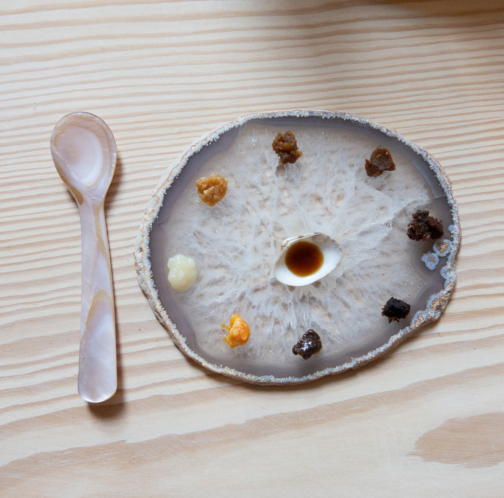 Po krátké tour usedáme ke stolu a degustujeme na leštěném minerálu různě stará misa a různé druhy shoyu, garumů a rybích omáček. Všechno je v chuti bezvadně čisté, nerozpoznávám žádnou oxidaci, nadměrné projevy vitamínu B nebo ethyl-acetátu. Tenhle chlapíček rozhodně ví, co dělá a dělá to hrozně rád. Diskutujeme výrobní procesy, skryté špeky, které na misaře čekají, úskalí vaření v páře, odrůdy kodži, konzistenci past a jejich mletí, teploty zrání nebo vliv soli a mě hřeje, že mu rozumím každé slovo a že jsem vlastně doma vypozoroval úplně to samé.