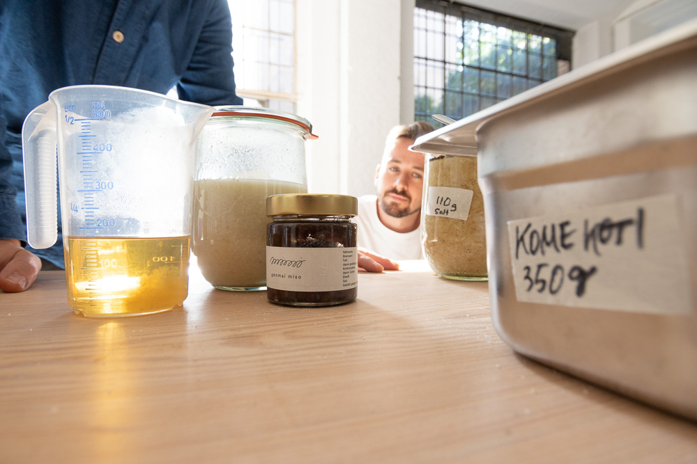 Markus Shimizu žije v Německu už přes dvacet let. Práci zkusil už ledajakou, ale vždycky ho to táhlo (jako mnohé jiné — přes zdraví) k fermentování. Nejdřív pár drobných pokusů, pak plný byt flašek, pak rozdávání přátelům a pak objednávky, které se prostě v malém bydlení už nedaly zrealizovat. Před šesti lety vznikla tedy malá dílna mimi ferments, kde mohl začít zkoušet oficiálně vyrábět své miso. Zpočátku to šlo ztuha a bylo nutné investovat do času, materiálu a vybavení, ale vyplatilo se a po přesunu do krásných větších prostor se mohl sen o opravdovém a soběstačném provozu zhmotňovat.