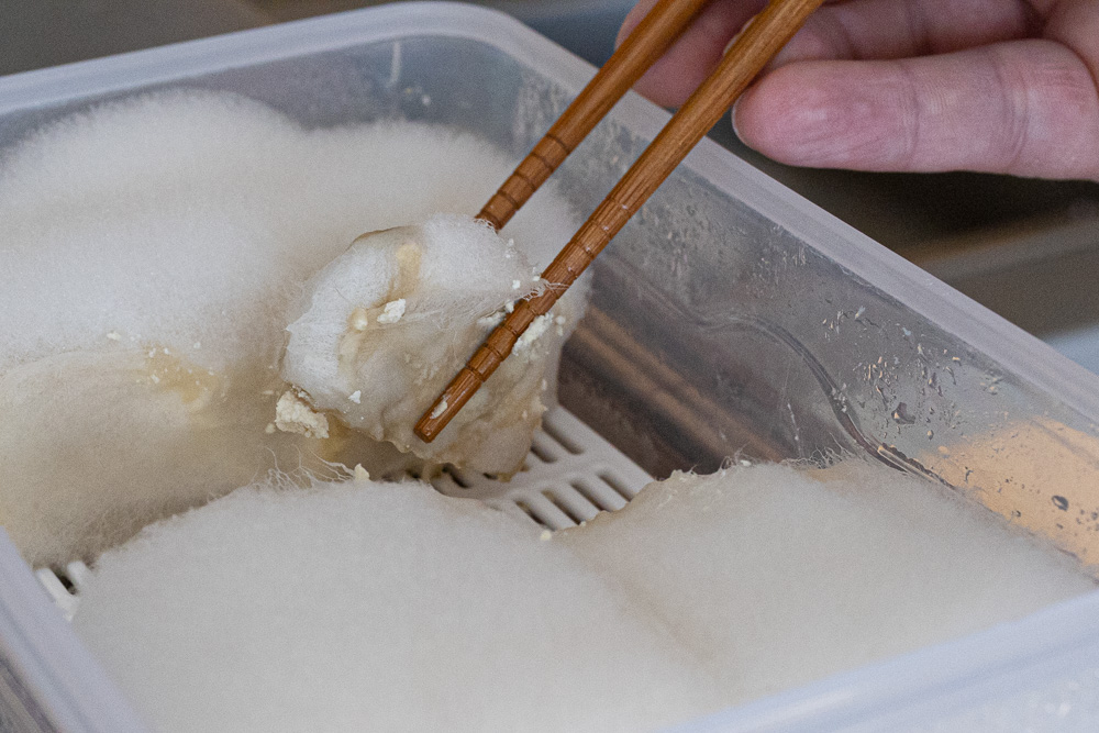 Rozměklé tofu i s myceliem se dá rozmačkat a použít jako součást různých past a pomazánek.