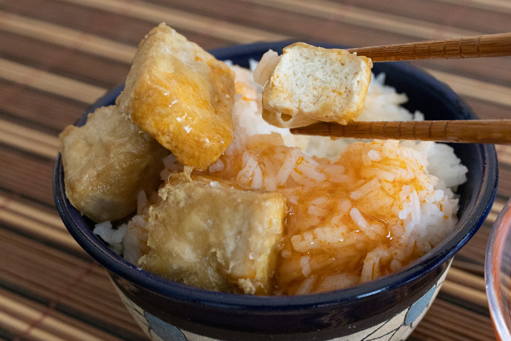 Nejjednodušší je kostičky oddělit, zlehka posolit a fritovat ve vysoké vrstvě oleje asi pět minut na 150 °C. Řekl bych, že horkovzdušná fritéza bude taky fungovat, ale trochu bych se bál, že nenávratně načuchne. Ofritované tofu pak patří do salátů, dá se namáčet do klasických sladkokyselých omáček nebo do sójovky, hodí se do stir-fry nebo do salátů. Tvoří to příjemnou krustičku, chuťově bych to přirovnal vzdáleně k čerstvému tempehu — stále to zůstává uvnitř neutrální, ale oproti syrovému tofu je kůrka voňavější a zlatavější. Osmažené kousky ten zápach značně ztrácí, zvlášť pokud nenecháte tofu fermentací rozpliznout na úplný syreček.